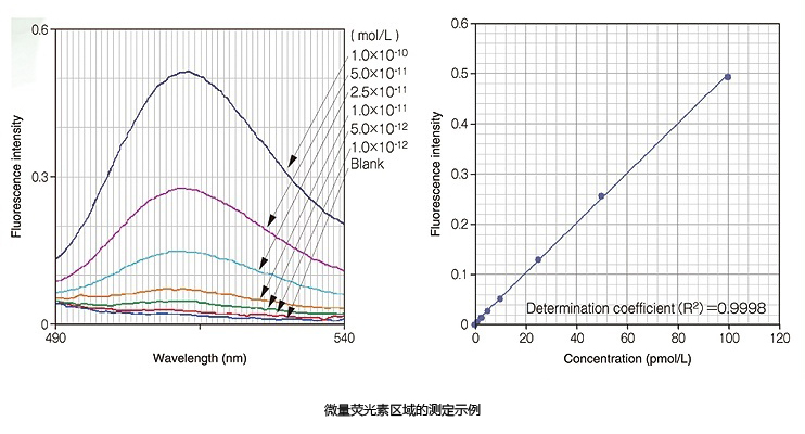 超高靈敏度在實際分析案例中體現(xiàn)更為明顯,以Blank(純水)為參照,使用F-4700可檢測低至1×10-12mol/L(亞皮摩爾)量級的熒光素。從線性曲線圖可知,即使在痕量區(qū)域,也能獲得很好的線性關系。