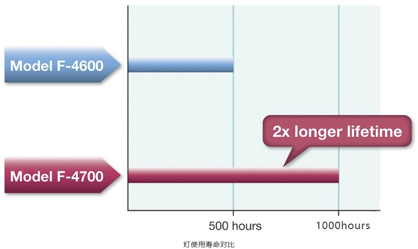 F-4700采用全新氙燈,并改良了燈電源,使得光源亮度提升,并有效延長氙燈的使用壽命至1000小時。延長燈泡更換周期可降低耗材成本,減輕燈泡更換等作業(yè)負擔。
