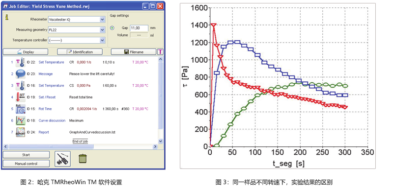 本文使用賽默飛 哈克Viscotester iQ智能流變儀配合 兩種4 葉片的槳葉式轉(zhuǎn)子(FL16 和 FL22)在通用夾持 器上通過(guò)控制速率模式進(jìn)行實(shí)驗(yàn),轉(zhuǎn)子葉片直徑分別為 16 和 22 毫米,高度分別為8.8 和 16 毫米(圖1),儀 器轉(zhuǎn)速設(shè)置為0.05rpm。5 中市售醬類(lèi)產(chǎn)品分別使用不 同的轉(zhuǎn)子,采用相同的實(shí)驗(yàn)參數(shù)進(jìn)行測(cè)試。將產(chǎn)品容器 蓋子打開(kāi),直接放置在通用夾持器上面。利用手動(dòng)控制 升降功能和哈克 TMRheoWinTM 軟件設(shè)置(圖 2)以保證 轉(zhuǎn)子保持靜止,然后垂直的將轉(zhuǎn)子插入到具有高度重復(fù) 性的測(cè)量位置。實(shí)際經(jīng)驗(yàn)表明,較硬的產(chǎn)品在生產(chǎn)線(xiàn)上 以較高的速度罐裝時(shí),產(chǎn)品在容器內(nèi)的不同區(qū)域可能表 現(xiàn)出不一樣的性質(zhì)。因此每次實(shí)驗(yàn)都必須保證槳葉轉(zhuǎn)子 在產(chǎn)品容器中的位置是相同的,以確保測(cè)試結(jié)果的重復(fù) 性和可靠性。當(dāng)樣品經(jīng)過(guò)短暫的平衡和恢復(fù)后,測(cè)試時(shí) 間被重置為 0。然后設(shè)置一個(gè)非常低轉(zhuǎn)速(0.05rpm), 旋轉(zhuǎn)的時(shí)間以及在此時(shí)間段內(nèi)所需要的數(shù)據(jù)點(diǎn)的數(shù)量。 最后可以加入數(shù)據(jù)自動(dòng)評(píng)估的設(shè)置以及生成實(shí)驗(yàn)報(bào)告。 實(shí)驗(yàn)報(bào)告可以保存為多種格式(比如 pdf,jpeg,tiff 等) 或者直接由打印機(jī)輸出。對(duì)于每一類(lèi)樣品,都需要進(jìn)行 簡(jiǎn)單的預(yù)實(shí)驗(yàn)來(lái)確定最合適的轉(zhuǎn)子型號(hào)。比如較小尺寸 的轉(zhuǎn)子適合測(cè)試具備較高屈服應(yīng)力的樣品,比如花生醬; 而尺寸大的轉(zhuǎn)子則適用于測(cè)試低粘度、低屈服應(yīng)力的樣 品,例如巧克力醬,果醬或者蛋黃醬 [7]。為了確定合適 的轉(zhuǎn)速,則需要進(jìn)行多種轉(zhuǎn)速的實(shí)驗(yàn)。轉(zhuǎn)速太高則會(huì)在 曲線(xiàn)上形成一個(gè)難以計(jì)算的尖峰(圖3中紅色三角形),轉(zhuǎn)速太低則會(huì)產(chǎn)生漸進(jìn)型的曲線(xiàn)(圖3 綠色圓圈)。而 我們的目的是選擇一個(gè)合適的轉(zhuǎn)速,使得實(shí)驗(yàn)曲線(xiàn)具有 一個(gè)可以評(píng)估的最大值(圖3 藍(lán)色長(zhǎng)方形)。前期實(shí)驗(yàn) 證明,0.05rpm 的轉(zhuǎn)速是最適合這些樣品的。