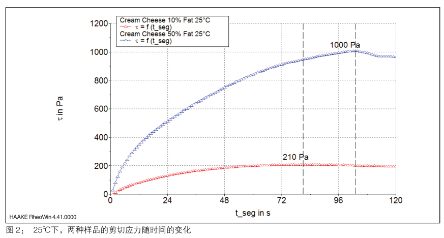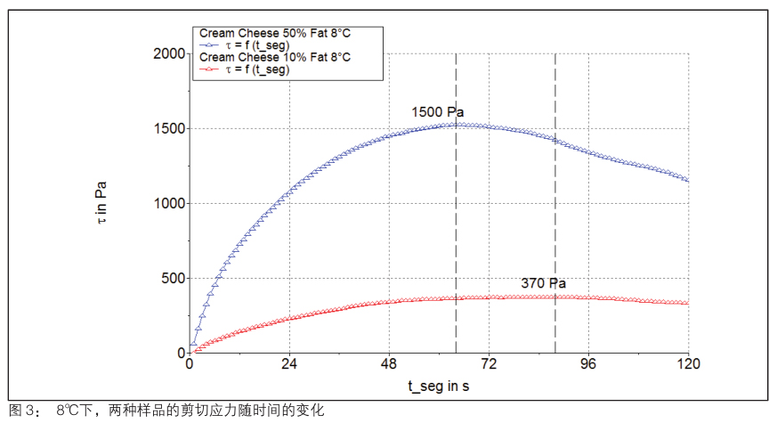 彈性響應后,其結構遭到破壞并且剪切應力開始下降。實驗結果中剪切應力在整個測試時間內(nèi)的最大值就對應了樣品的屈服應力。圖 2 是兩種樣品在室溫下的測試結果,可以看出,脂肪含量高的樣品的屈服應力為 1000Pa,而低脂肪含量樣品的屈服應力則為210Pa。而圖 3 則是兩種樣品在較低溫度下(8℃)的結果,相當于樣品剛從冰箱內(nèi)取出的溫度。其結果表明高、低脂肪含量的樣品在此溫度下的屈服應力都有所上升,分別為 1500Pa 和 370Pa。結合上述結果,當考慮將此類食品涂抹在某些剪切模量低至1200Pa 白面包上時就會出現(xiàn)問題,因為在冷藏條件下的奶油奶酪的屈服應力遠大于面包所能承受的剪切模量。