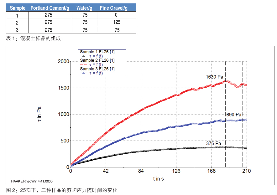 所得結(jié)果如圖 2 所示。可以看到,在 25℃測試條件下,純的水泥漿體系的屈服應(yīng)力為 375Pa,而含有 75 克和 125 克增塑劑的樣品的屈服應(yīng)力分別為 890Pa 和 1630Pa。然后這些樣品的屈服應(yīng)力就可以通過經(jīng)驗公式轉(zhuǎn)變?yōu)榛炷了鋵嶒灅?biāo)準(zhǔn)數(shù) [6]: