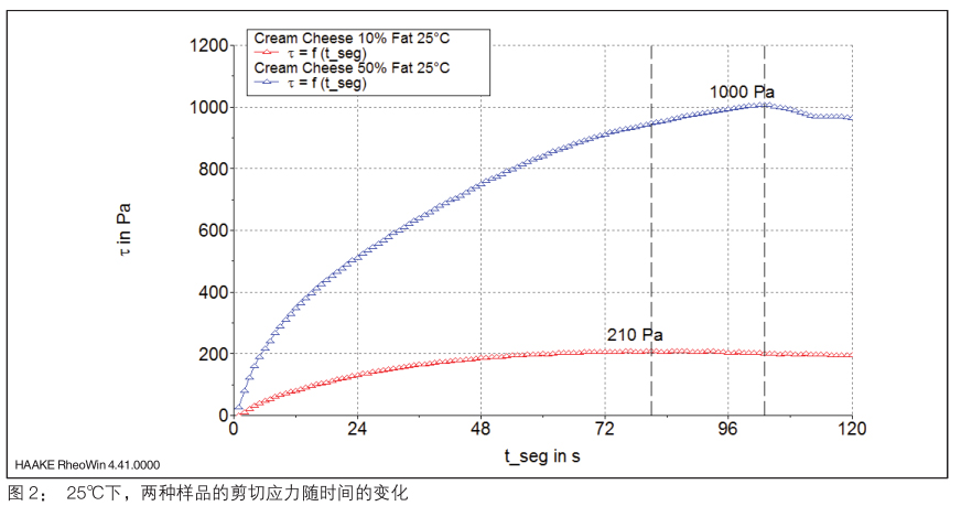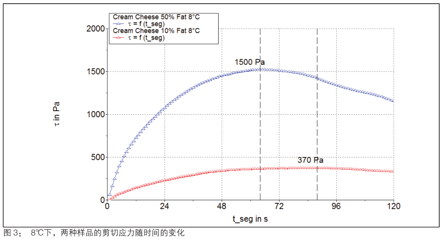 當(dāng)槳葉式轉(zhuǎn)子完全浸沒在樣品后,設(shè)定轉(zhuǎn)速參數(shù)為 0.05rpm 進(jìn)行測試,然后觀察剪切應(yīng)力隨時間的變化趨勢。在樣品發(fā)生初期彈性響應(yīng)后,其結(jié)構(gòu)遭到破壞并且剪切應(yīng)力開始下降。實(shí)驗(yàn)結(jié)果中剪切應(yīng)力在整個測試時間內(nèi)的最大值就對應(yīng)了樣品的屈服應(yīng)力。圖 2 是兩種樣品在室溫下的測試結(jié)果,可以看出,脂肪含量高的樣品的屈服應(yīng)力為 1000Pa,而低脂肪含量樣品的屈服應(yīng)力則為210Pa。而圖 3 則是兩種樣品在較低溫度下(8℃)的結(jié)果,相當(dāng)于樣品剛從冰箱內(nèi)取出的溫度。其結(jié)果表明高、低脂肪含量的樣品在此溫度下的屈服應(yīng)力都有所上升,分別為 1500Pa 和 370Pa。結(jié)合上述結(jié)果,當(dāng)考慮將此類食品涂抹在某些剪切模量低至1200Pa 白面包上時就會出現(xiàn)問題,因?yàn)樵诶洳貤l件下的奶油奶酪的屈服應(yīng)力遠(yuǎn)大于面包所能承受的剪切模量。
