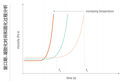 凝膠化時間和窗口期是黏合劑極重要的工藝參數(shù)。在化學固化反應開始(ts)前,黏度保持恒定,在黏度接近無限黏度(t時,樣品固化日不能再使用。在恒定低切速率或旋轉(zhuǎn)速度進行時間相關(guān)測試間和以分析窗口期凝膠化時固化過程
