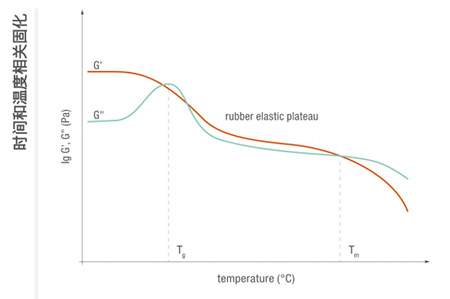 在振蕩測試中,可在整個過程中對材料進行表征:應用前作為液體黏合劑,以監(jiān)測固化過程以及評定最終固化產(chǎn)品。在此處,使用彈性和黏性模量(G’和 G”)描述樣品特性,兩者均用干等溫測試和溫度掃描。部分結(jié)晶的熱熔黏合劑的升溫曲線包括玻璃化轉(zhuǎn)變溫度(Ts)橡膠態(tài)平臺以及最終熔點 (Tm),超過熔點后黏合劑會變成液體并能使用。