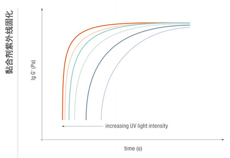 可應用不同紫外光強度以顯示對印刷油墨紫外線固化的影響:應用的紫外光強度越高,固化過程進展越快,且樣品的最終硬度(G')越高。