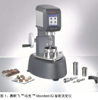 融化的巧克力的流動行為在很多情況下都是一個關(guān)鍵因 素。其生產(chǎn)運(yùn)輸、灌裝、浸漬及注射等過程需要巧克力 具有非常適合的粘度及屈服應(yīng)力。同樣,最終產(chǎn)品的外 觀及口感也直接受到其粘性行為的影響。 對于巧克力生產(chǎn)公司或者以巧克力為原料的制品公司, 比如巧克力曲奇制造商來說,測試其粘度已經(jīng)成為一個 標(biāo)準(zhǔn)的質(zhì)量控制方法。 為了滿足客戶在質(zhì)控過程中快速,簡單,更加可靠的進(jìn) 行粘度測試,新一代賽默飛 TM 哈克 TM Viscotest iQ 智能 流變儀(圖1)已經(jīng)問世。這臺設(shè)計獨(dú)一無二,基于質(zhì) 控應(yīng)用的儀器具有很多新的特點(diǎn)。比如,它的靈敏度的 高度提升保證了其可以使用更小的測量夾具,并可以節(jié) 約用戶的樣品以及溫度平衡的時間和清理時間。同時也 提高了其測量更低的剪切速率的能力,改善了其利用數(shù) 學(xué)模型進(jìn)行模擬計算的可靠性,比如用卡松模型來擬合 計算樣品的屈服應(yīng)力 [1]。