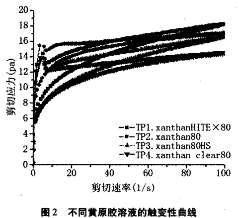 圖 2 中各黃原膠溶液的觸變性較相近, 由于滯后曲線中形成支弧形,表示溶液有凝膠強(qiáng)度,因破壞凝膠結(jié)構(gòu)需要的應(yīng)力,使溶液恢復(fù)正常表觀粘度。