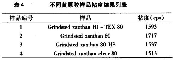 (1)4 種黃原膠的粘度大小為:2一xanthan?。福?>1 一xanthan?。娶?’EX80 >3 一xanthan?。福埃龋?>4 一 xam-than clear80。 4種黃原膠 1% 水溶液的假塑性和觸變性相近。