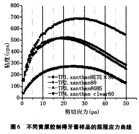 (3)屈服應(yīng)力可體現(xiàn)牙膏的制造和包裝容易性,4 一xanthan clear80 更容易運(yùn)輸, 洗刷分散性更好,更容易從牙膏管中擠出。