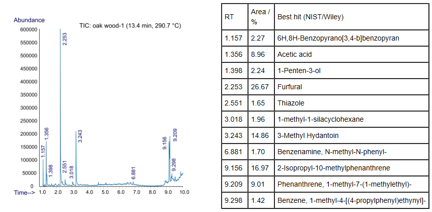 橡樹(shù)木熱裂解過(guò)程第二階段的總離子色譜圖,以及相關(guān)主峰的譜庫(kù)搜索結(jié)果如下(下表以滯留時(shí)間(RT/min)的升序排列):
