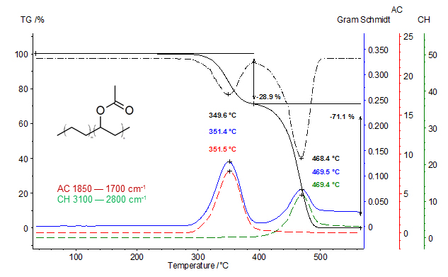 在下圖中顯示了 TGA 曲線(黑色),DTGA 曲線(黑色點劃線)和 Gram-Schmidt 譜圖(藍色)。另外兩個的提出曲線(吸收強度隨溫度變化曲線;紅線和綠線)和DTGA曲線有很好的相關(guān)性。在 350°C 的第一個失重步驟是由于乙烯的揮發(fā)(紅色曲線)。在第二個失重步驟中,乙烯已經(jīng)完全揮發(fā)。綠色的曲線表示了由于聚合物主鏈分解而釋放出的碳?xì)浠衔锏奈諒姸茸兓^程(DTGA 峰值為468°C)