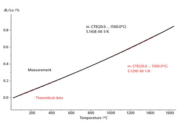 實(shí)驗(yàn)中,計(jì)算所得的 20°C 到 1500°C 下的平均 CTE 為 5.143×10-6 1/K,與理論值僅僅相差 1.4×10-8 1/K。理論值為 5.129×10-6 1/K(來(lái)自NIST標(biāo)準(zhǔn)數(shù)據(jù)表)。