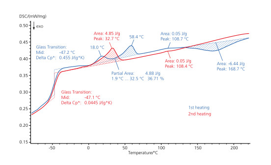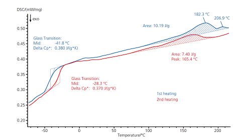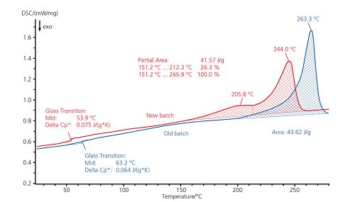 圖中顯示了看似相同的兩種顆粒的 DSC 曲線,樣品為 PA66,分別在不同時間交付(以 20K/min 的速率降溫后二次升溫)。藍色曲線(舊樣)上在 63°C 出現(xiàn)玻璃化轉(zhuǎn)變,263°C 出現(xiàn)熔融峰,均為 PA66 的典型表現(xiàn)。在新料(紅色曲線)上則出現(xiàn)了雙峰,峰值溫度為 206°C 和 244°C。這表明新料中可能存在與 PA66 共混的第二種聚合物。