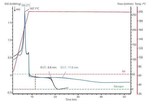 OIT 測試(氧化誘導時間)是用于評價聚合物特別是聚烯烴耐氧化性的常用測試方法。在這個例子中,兩個 PP 樣品在動態(tài)氮氣氣氛下加熱到 200°C。在加熱過程中檢測到的吸熱峰對應(yīng)于聚丙烯的熔融。在 200°C 恒溫 3 分鐘,將氣體切換至空氣。其后出現(xiàn)的放熱效應(yīng)為聚合物的氧化分解。此例中,樣品A(OIT 6.6分鐘)比樣品B(OIT 11.6分鐘)更早的發(fā)生了氧化反應(yīng)。