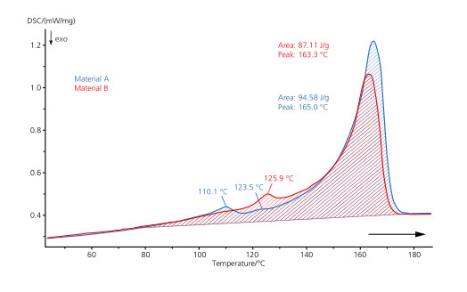 通過二次升溫曲線可做進一步驗證,除了 165℃ 和 163℃ 的吸熱峰(PP材料典型的熔融峰),藍色曲線在 110℃ 和 124℃ 還有兩個吸熱峰,說明材料 A 中還含有 LDPE、LLDPE 或 HDPE(熔融溫度隨密度增大而升高)等額外的組分。相反,材料 B 中僅在 126℃ 有一個小的吸熱峰。