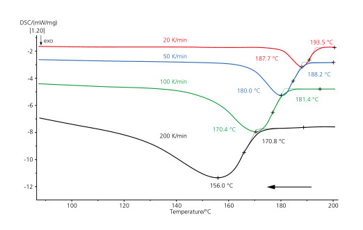 本例顯示的是含 30%wt 玻璃纖維的PBT材料,以多種不同的降溫速率(20K/min到200K/min)冷卻后的升溫曲線。