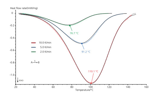 本例研究雙組分環(huán)氧粘合劑的固化過程,將三個樣品以不同速率(2K/min、5K/min 和 10K/min)升溫至 200℃,固化反應(yīng)的峰值溫度隨升溫速率提高而升高。單步反應(yīng)的動力學模型與試驗曲線基本重合,相關(guān)系數(shù)高于 0.999。因此,此模型可用于對等溫和用戶自定義的溫度程序下的反應(yīng)進行預測。