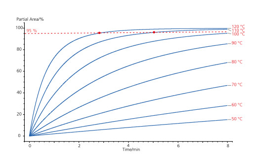 下圖顯示的是不同溫度下恒溫時樣品的固化度隨時間的變化,由軟件基于動力學模型計算得到。在 120℃ 下恒溫 3min,樣品的固化度即達 95%,而在 110℃ 下達到同等固化程度需要恒溫 5min 以上。