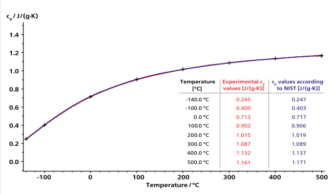 藍(lán)寶石是比熱測試時(shí)常用的參比樣品,比熱值已知。DSC 3500 Sirius 測試了藍(lán)寶石在 -140℃ 到 500℃ 范圍內(nèi)的比熱,并與 NIST 提供的理論值進(jìn)行比較。在測試的溫度范圍內(nèi),實(shí)測值與理論值的最大偏差為 0.8%。