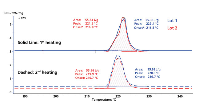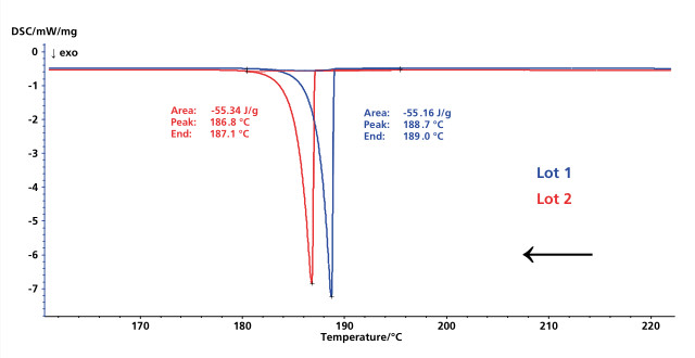 然而,2 個(gè)樣品的降溫曲線(一次升溫后降溫)卻不盡相同,Lot1(藍(lán)色曲線)結(jié)晶溫度為189℃(終點(diǎn)),Lot2(紅色曲線)結(jié)晶需要更大的過冷度,起始結(jié)晶的溫度低于 Lot1,終止點(diǎn)溫度為 187℃。結(jié)晶溫度的差異與樣品中的雜質(zhì)含量不同有關(guān)。這個(gè)例子說明 DSC 3500 Sirius 可以對樣品進(jìn)行快速的質(zhì)檢。此外,還說明降溫測試的重要性,尤其是樣品的升溫曲線相近時(shí)。