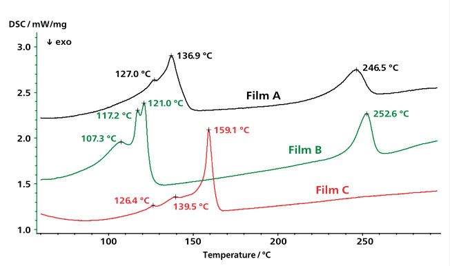 DSC 測試 3 種不同聚合物薄膜包裝袋。樣品質(zhì)量:0.692mg(樣品 A),1.45mg(樣品 B),0.919mg(樣品 C)。坩堝:Al,加蓋扎孔。