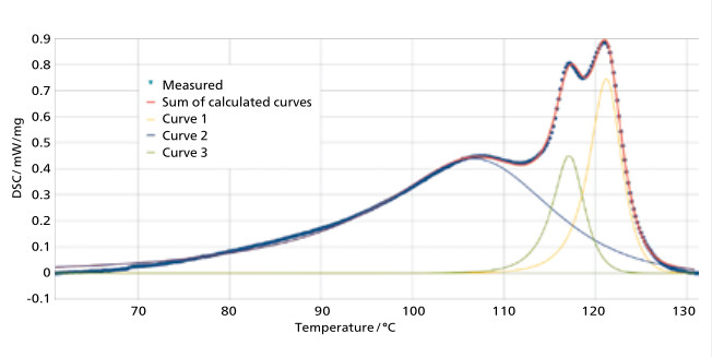 右圖為采用峰分離軟件將 B 樣品在 100℃ 到 125℃ 之間的峰進(jìn)行分離后的結(jié)果,可以看出,原來重疊的峰被分離成 3 個(gè)獨(dú)立的峰,峰值溫度分別為 107℃、117℃ 和 121℃,且實(shí)測曲線(點(diǎn)畫線)與 3 條計(jì)算曲線擬合成的總曲線(紅色)幾乎完全重合,說明分離效果很好。峰分離有助于準(zhǔn)確計(jì)算單個(gè)峰的峰值和峰面積。