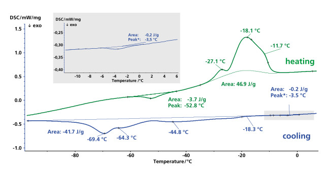 DSC 3500 Sirius 同樣適用于食品行業(yè)的研究。這里我們給出了菜籽油的 DSC 測量結(jié)果。樣品首先冷卻到 -150℃,再加熱至 40℃。冷卻速率為 10K/min,由于油的結(jié)晶,在 -18℃ 開始出現(xiàn)放熱峰。曲線在 -45℃,-64℃,-69℃ 出現(xiàn)最小值,顯示菜籽油主要成分為油酸、亞麻油酸和亞麻酸等各類飽和與不飽和脂肪酸。-4℃ 的放熱峰可能為添加劑的結(jié)晶。在隨之的升溫過程中,在 -53℃ 出現(xiàn)冷結(jié)晶峰,接著是菜籽油各組分的熔融峰(峰值溫度 -27℃,-18℃ 與 -12℃)。