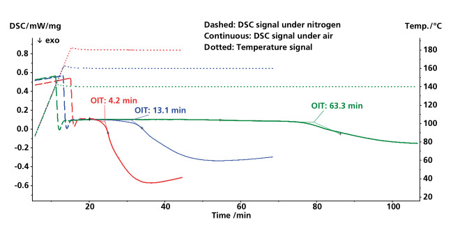 根據(jù)氧化誘導(dǎo)期的時(shí)間長短可以判斷碳?xì)浠衔锏难趸€(wěn)定性。這些在 DSC 3500 Sirius 上都可以輕易地實(shí)現(xiàn)。這里給出了菜籽油樣品在惰性氣氛(N2 氣氛)下,三次升至不同溫度下的測量結(jié)果。5 分鐘平衡時(shí)間后,氣氛切換成空氣。右圖 DSC 曲線給出了不同測試溫度對樣品氧化裂解的影響。溫度越高,樣品氧化開始的越早:在 140℃ 需要 63min 樣品開始氧化,而在 180℃ 僅需 4min。