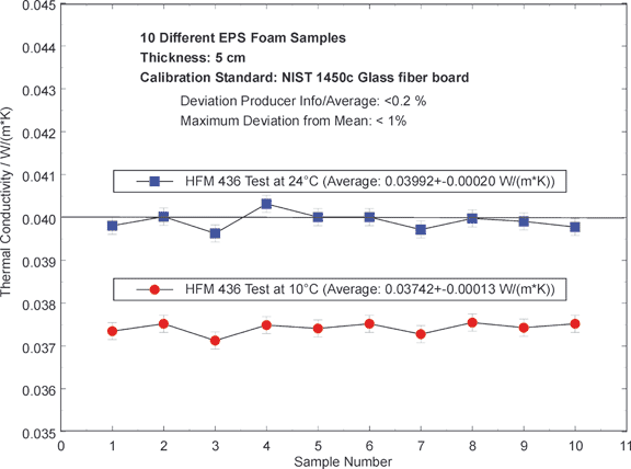 膨脹聚苯乙烯是在絕熱建筑材料領(lǐng)域使用得最多的材料之一。例中顯示了對(duì)一種商業(yè)化的膨脹聚苯乙烯材料(EPS 040)的質(zhì)量檢測(cè)結(jié)果。在 24°C 、以及按照 DIN EN 13163 標(biāo)準(zhǔn)在 10°C 下測(cè)量了同一批號(hào)中的十個(gè)樣品??梢郧逦乜吹讲煌瑯悠分g的測(cè)量偏差小于 1%。根據(jù) DIN 13163 計(jì)算得到的導(dǎo)熱系數(shù) λ 90/90 為 0.03808 W/(m*K)。