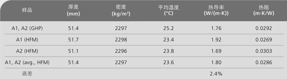 Netzsch HFM 測(cè)試較高導(dǎo)熱系數(shù)材料的關(guān)鍵是配備擴(kuò)展配件(Instrumentation kit)。下圖對(duì)三種類(lèi)型的混凝土樣品進(jìn)行測(cè)試,得到的熱導(dǎo)率結(jié)果與保護(hù)熱板法(GHP)測(cè)得的熱導(dǎo)率結(jié)果十分吻合。