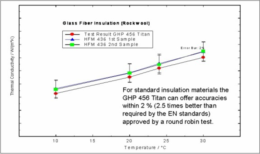 礦棉是一種用途廣泛的材料,主要用于住宅建筑的保溫。本例使用保護(hù)熱板法(GHP 456 Titan)和熱流法(HFM 436 series),對(duì)礦物纖維在 10℃ 到30℃ 之間進(jìn)行循環(huán)測(cè)試,研究其導(dǎo)熱性能。和其他大多數(shù)保溫材料類(lèi)似,礦物纖維在室溫附近的導(dǎo)熱系數(shù)隨著溫度的升高呈線(xiàn)性增加。用不同的測(cè)試儀器得到的結(jié)果有很好的一致性。通過(guò)循環(huán)測(cè)試進(jìn)一步證明,保護(hù)熱板法的測(cè)試精度可以達(dá)到 2 %。