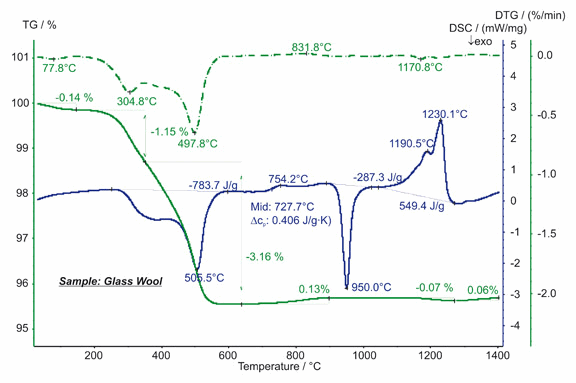 玻璃棉常用作房屋與加熱管道的隔熱材料。STA 測(cè)試在約 600°C 以下顯示了三個(gè)失重臺(tái)階,這些是由于吸附水的揮發(fā)與有機(jī)粘合劑的燒失所致。其中有機(jī)粘合劑的燒失對(duì)應(yīng)于該溫度范圍內(nèi)的強(qiáng)烈的 DSC 放熱峰。玻璃化轉(zhuǎn)變?cè)?DSC 曲線上表現(xiàn)為 728°C 附近的臺(tái)階,比熱增加 0.41J/(g*K)。950°C 的 DSC 放熱峰對(duì)應(yīng)于結(jié)晶效應(yīng),熱焓 -287 J/g;1050°C 至 1250°C 之間的吸熱效應(yīng)對(duì)應(yīng)于熔融,總熱焓 549 J/g。700°C 以上的微量的質(zhì)量變化最可能是由于雜質(zhì)的氧化與揮發(fā)所致。