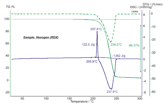 烈性炸藥黑索金(也稱(chēng)RDX,T4等)在150°C 就開(kāi)始升華,從熱重曲線即可看出。在DSC曲線上,起始點(diǎn)為206°C的吸熱峰,主要是樣品的熔融,其熱焓值為123J/g。在200°C…250°C之間,有劇烈的放熱現(xiàn)象,并釋放出1.38KJ/g的熱量。該實(shí)驗(yàn)的樣品量為2.32mg,升溫速率為5K/min,氣氛為合成空氣。