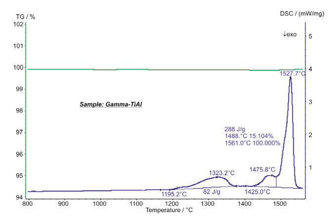 難熔合金 γ-TiAl 可通過(guò)高溫和低密度耐腐蝕測(cè)試進(jìn)行鑒別。一般用于航空航天領(lǐng)域的渦輪充電器、燃?xì)鉁u輪和發(fā)動(dòng)機(jī)。圖中 DSC 曲線顯示,在外推起始點(diǎn)溫度 1195°C 時(shí)有一吸熱效應(yīng)(峰值溫度為1323°C),主要是 α2 →α 相轉(zhuǎn)變過(guò)程。在 1476°C(峰值溫度)時(shí),α 相向 β相轉(zhuǎn)變。DSC曲線上 1528°C 時(shí)的吸熱峰主要是樣品的熔融過(guò)程(起始點(diǎn)溫度:1490°C,液相線溫度大約 1560°C)。在整個(gè)測(cè)試過(guò)程中,樣品質(zhì)量無(wú)明顯變化。