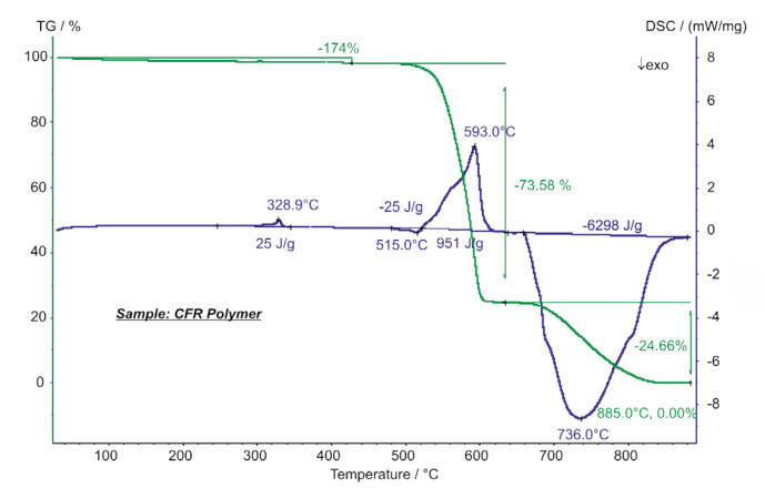 碳纖維增強(qiáng)高聚物(CFRP)是常用的復(fù)合材料。主要由聚合物和嵌入的碳纖維組成,具有質(zhì)量輕、硬度大、穩(wěn)定性強(qiáng)等特點(diǎn),適合汽車(chē)、航空航天領(lǐng)域的應(yīng)用。STA 的測(cè)試結(jié)果顯示,在 329°C 有一吸熱峰,其熱焓值為 25J/g,主要是聚合物的熔融過(guò)程。在大約 480°C…620°C之間主要是聚合物的分解。在 650°C,將氣氛由 N2 切換成 O2,碳纖維組分發(fā)生放熱分解(失重:24.7%)。實(shí)驗(yàn)結(jié)束時(shí)的殘余質(zhì)量 0.0% 表明樣品中無(wú)其他無(wú)機(jī)填充物或者玻璃纖維。