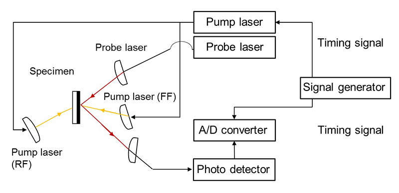 納米級薄層與薄膜的熱透過時間極短,傳統(tǒng)的激光閃射法(LFA)使用紅外測溫,采樣頻率相對較低,已不足以有效地捕捉納米級薄膜的傳熱過程。因此需要一種新的更快速的檢測方式,可以克服經(jīng)典的激光閃射法的技術(shù)局限。這一被稱為超快速激光閃射法的技術(shù),其典型模式為后部加熱/前部探測方法。