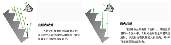 SE-PV獨(dú)特的設(shè)計(jì)可以滿足絨面基底上薄膜的量測(cè)需求,如下圖所示的樣品,絨面及其表面增透膜層的設(shè)計(jì)都是為了降低電池片表面對(duì)太陽光的反射,這使得探測(cè)信號(hào)變?nèi)酰蟠笤黾恿斯鈱W(xué)測(cè)量難度。