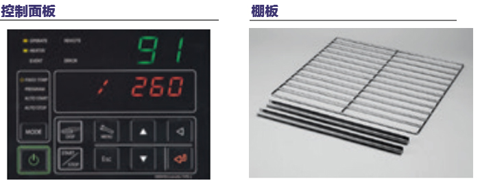 棚板(1件棚板包含2件棚受)、自動風門、N2導入裝置、記錄儀、組合警示燈(待機/運行/故障)、溫度輸出端子(4~20mA)、外部警報輸出 端子、時間到達輸出端子 |